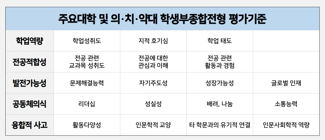 해당 부분들의 점수를 잘 챙겨 받는 것이 생기부 관리의 핵심이라고 할 수 있겠습니다.