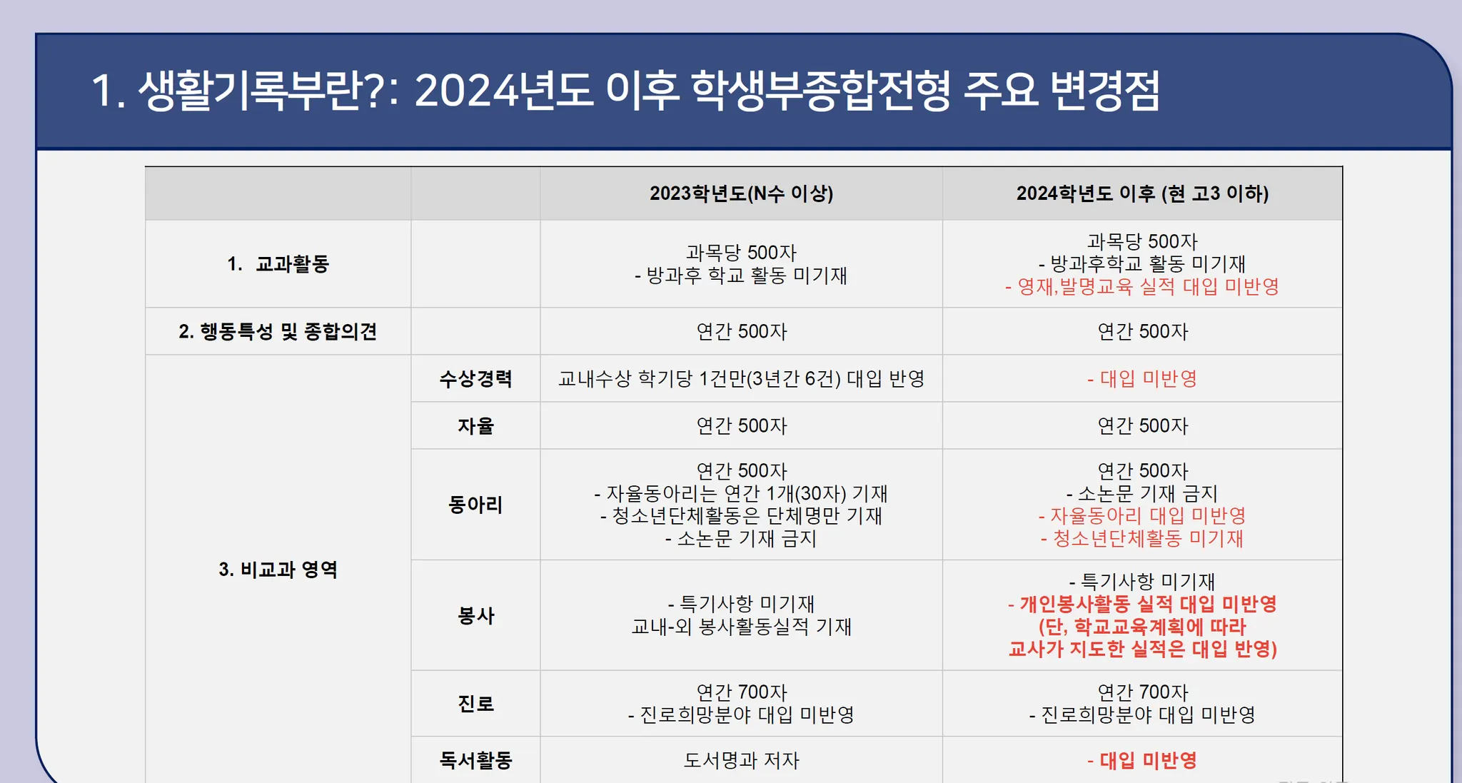 봉사활동, 독서 등이 2024학년도 이후에 대입 반영 항목에서 삭제됨.