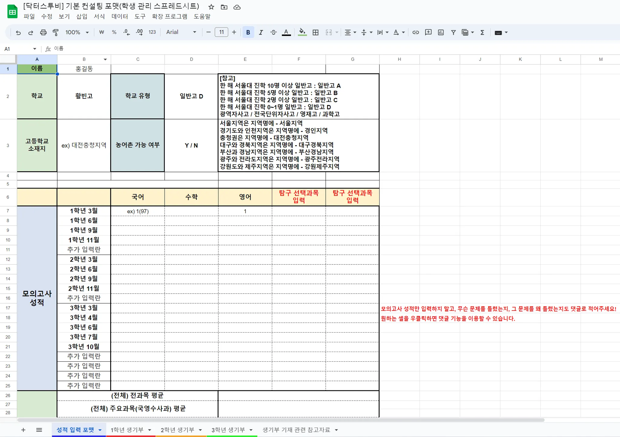 아래 탭을 보시면 [성적입력포맷] / [1학년 생기부] / [2학년 생기부] / [3학년 생기부]
